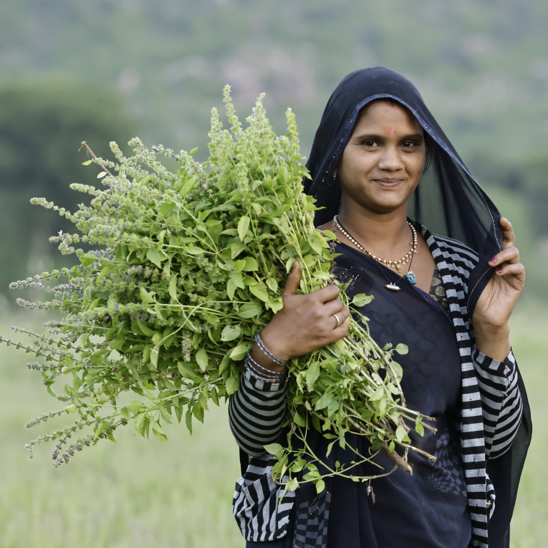 It all started with three farmers who began cultivating Tulsi Holy-Basil, one of the most revered herbs in India. Tulsi had never been grown as a commercial product, as locals previously only had this herb potted in their homes for spiritual protection.