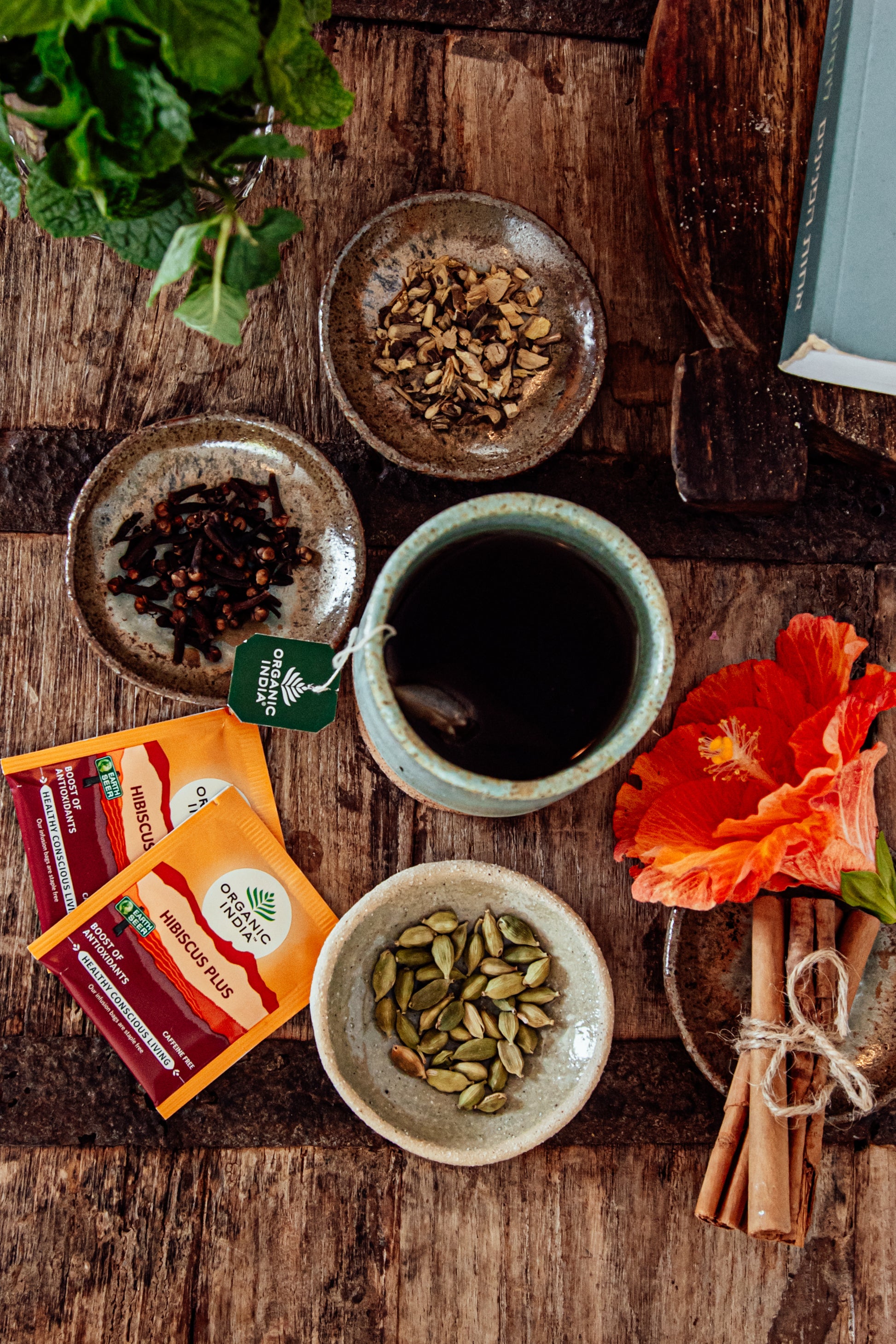 Indulge in the enchanting blend of ORGANIC INDIA Hibiscus Plus, a delightful Certified Organic fusion of hibiscus, licorice, peppermint, cardamom, cinnamon, and clove. Each sip is a journey through a vibrant tapestry of floral and spicy notes, awakening your senses and uplifting your spirit. Embrace the beauty of nature's healing power with every cup.